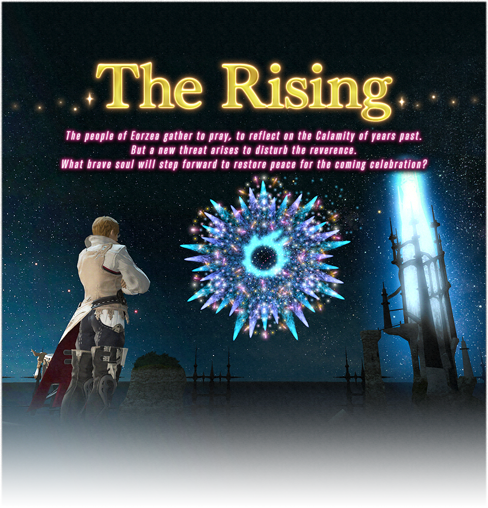 The Rising is an annual event in Final Fantasy XIV celebrating the anniversary of the game's relaunch as A Realm Reborn, replacing the Foundation Day event from the original version. This is one of the two seasonal events to be introduced after the A Realm Reborn's relaunch, the other being the Make It Rain Campaign. All other annual events were already in the game since 1.0.