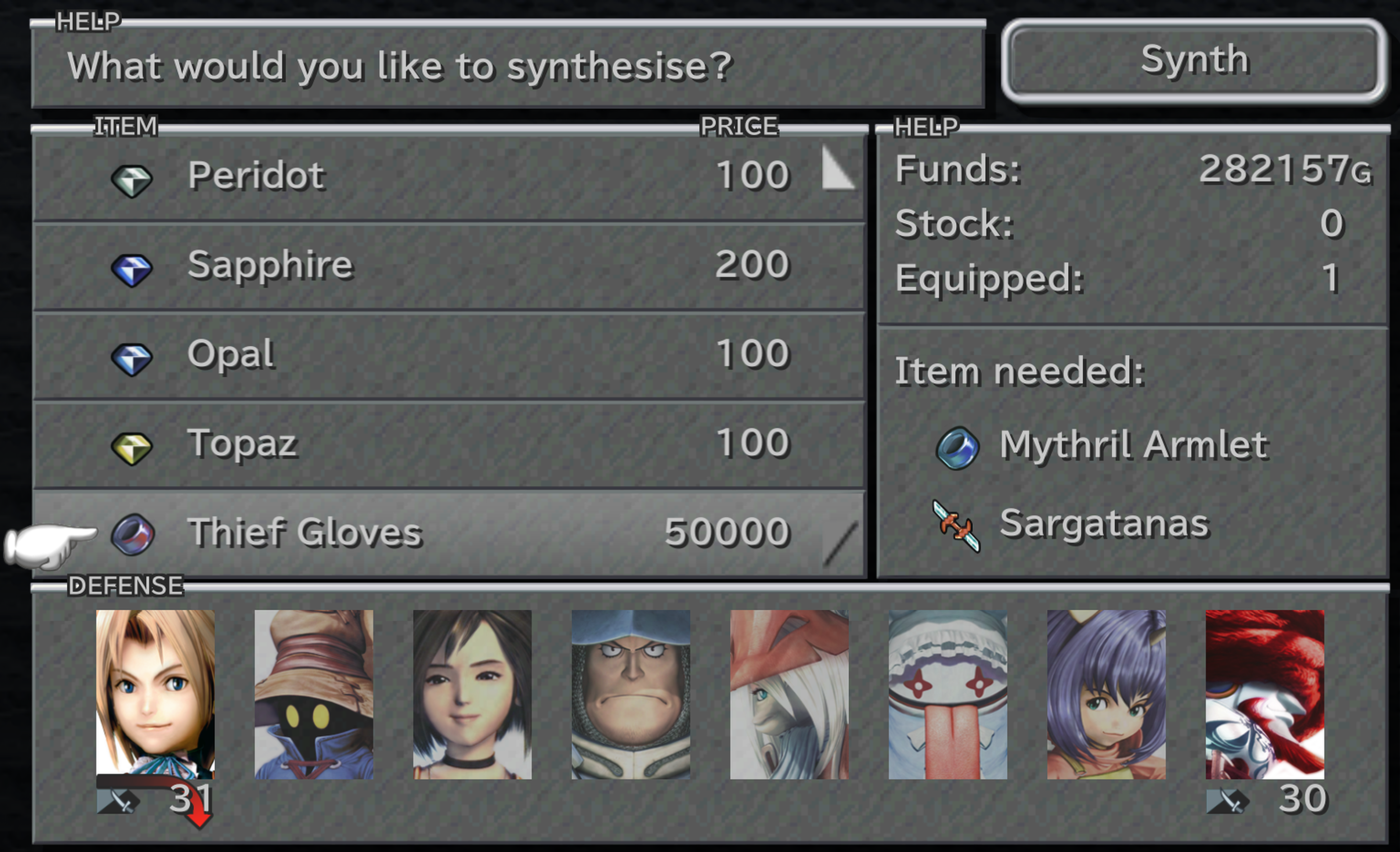 After the party has a flying transport, the gloves can be synthesized in Daguerreo for 50,000 gil, a Mythril Armlet, and a Sargatanas. If the player already got the gloves from the auction house, there is little point in making another pair, as it is so much more expensive, but synthesis is the only way to get two pairs of the gloves. The player can buy a Mythril Armlet while in Daguerreo, and Sargatanas is also synthesized here, but requires the limited item Zorlin Shape to make.