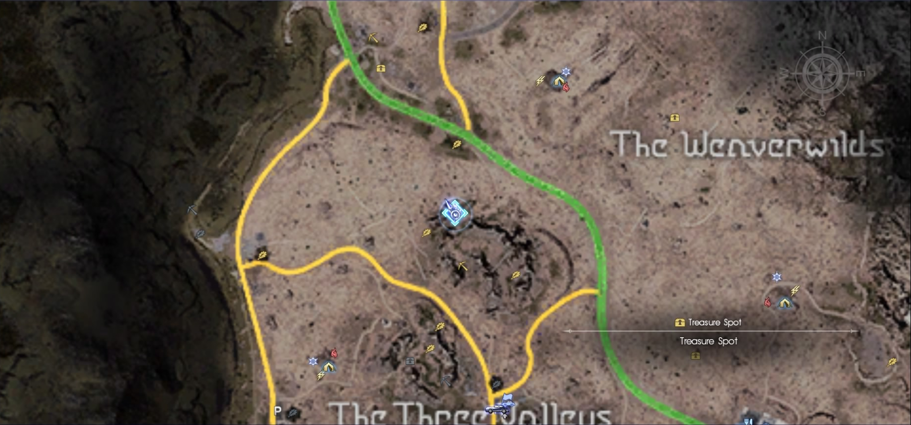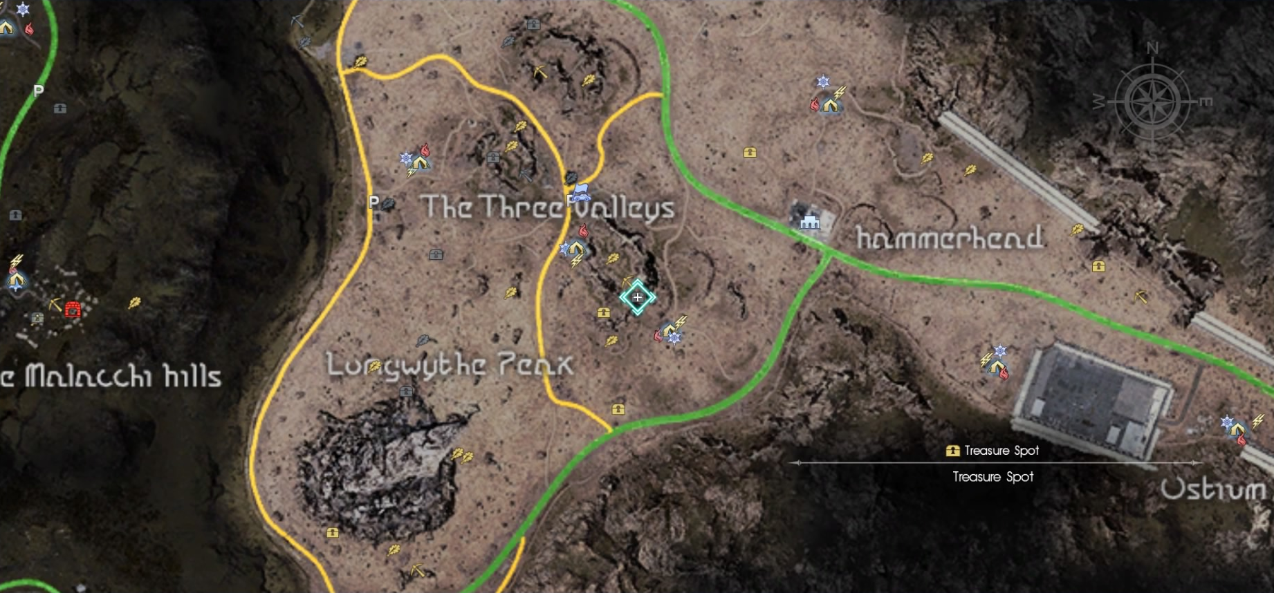 Northwest from the westernmost "valley" of the Three Valleys area are the remains of a building next to a segment of piping. The map is in the debris beneath it and marks a spot west of Longwythe Peak. The treasure is in a dip in the middle of a big rock to the west of the quest marker.