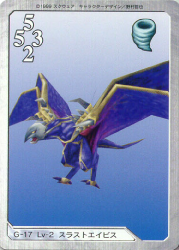 Thrustaevis is a Triple Triad card in Final Fantasy VIII used to play the minigame and for turning into items with Quezacotl's Card Mod. Thrustaevis is the seventeenth card in the inventory, the sixth basic Level 2 Monster Card.