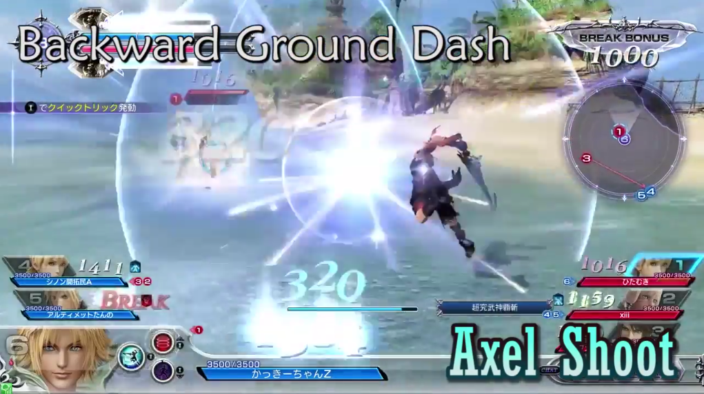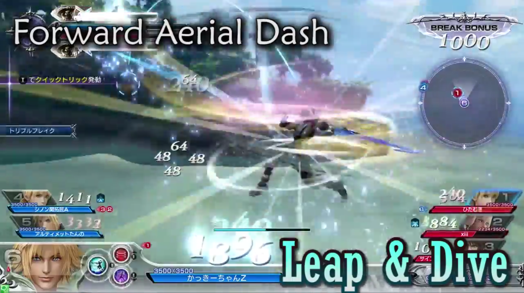 Tidus has a unique moveset where he has only two normal Bravery attacks, and a total of six Dash Bravery attacks, which are input like a normal character's Bravery attacks. Tidus' variety of attacks while dashing makes him difficult to predict, and he can easily go between ground and aerial dashes to change his potential moveset. His attacks often involve him leaping over or charging at opponents, letting him quickly close distance and punish the opponent while dodging their attacks. However, Tidus is reliant on being able to Dash to use his full moveset, and if the player is reckless and depletes Tidus' Dash gauge, he must take time to recover it before he can go on the offensive again. He also suffers from a lack of reliable close-range attacks, and needs distance to leap and charge at his opponents or else his follow-up attack may miss.
