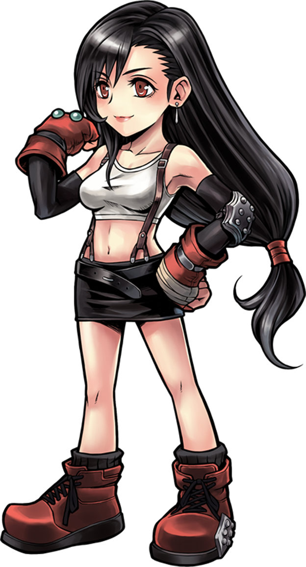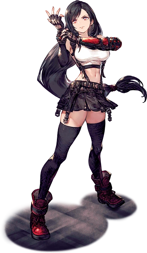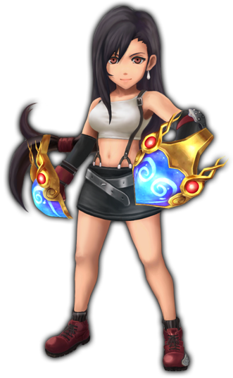 Tifa is an ally and a summonable Legend depicted in her Final Fantasy VII and Final Fantasy VII: Advent Children outfits, an event-related sailor uniform, a swimsuit, and a Santa Claus outfit. Her abilities are Beat Rush, Dolphin Blow, Meteor Strike, Somersault, and Final Heaven. She was first introduced in the event, "Final Fantasy VII — Calamity from the Skies", in which her abilities and weapons were made usable to successfully combat Jenova∙LIFE and Jenova∙DEATH.