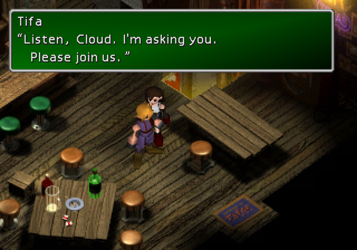 In Final Fantasy VII, during "At the Hideout in the Slums" on December 9,[6] Cloud returned to Tifa's bar following a successful mission to destroy Mako Reactor 1. Cloud attempted to quit Avalanche following an argument with Barret, though Tifa diffused the situation. She pleaded for Cloud to stay and reminded him of the promise they made as children, while reminding Barret that the group was in need of help.[16]