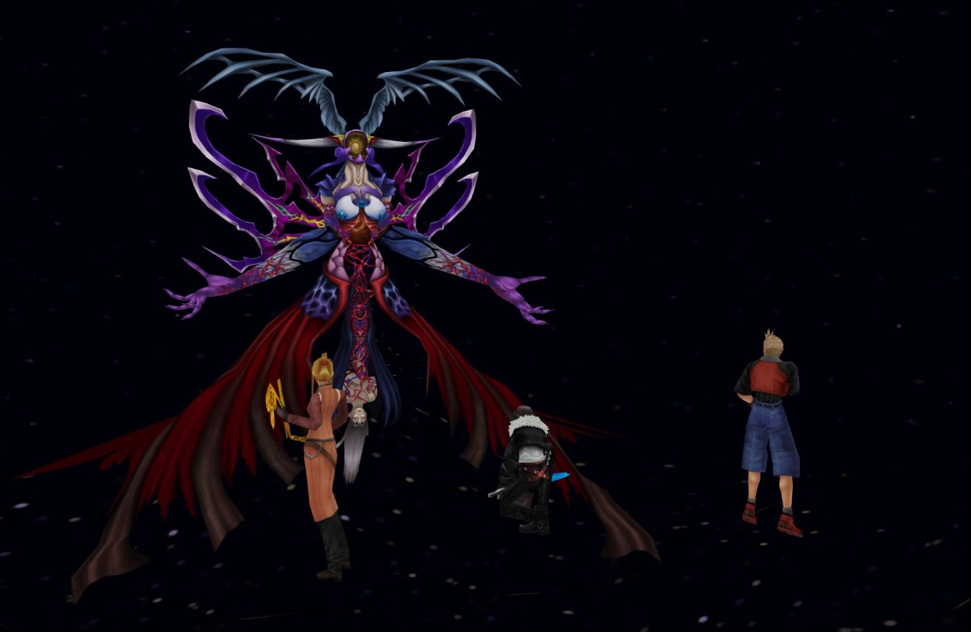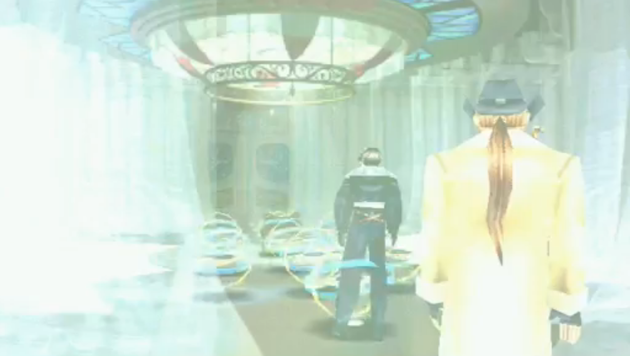 In keeping with time compression's psychedelic nature, the party initially lands in a version of Edea's waiting hall in Deling City, wherein the atmosphere is foggier and there is a save point. When the party steps on the save point, dozen more spring up around the room, all of them illusions. At the center of this room the party fights a series of sorceresses from across time and space.