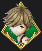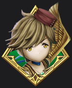 As depicted in his 5★ form, Toby still has his blond hair and yellow eyes. He wears a red bell-boy hat on his head. He has sprouted a single, golden wing from the left side of his back. He adorns his neck with a long, blue scarf while still wearing his green pendant. He wears a stylized and sleeveless red cloak adorned with gold lacing and a green jewel on his belt. He wears sheer stockings and black shin guards with gold ankle bracelets.