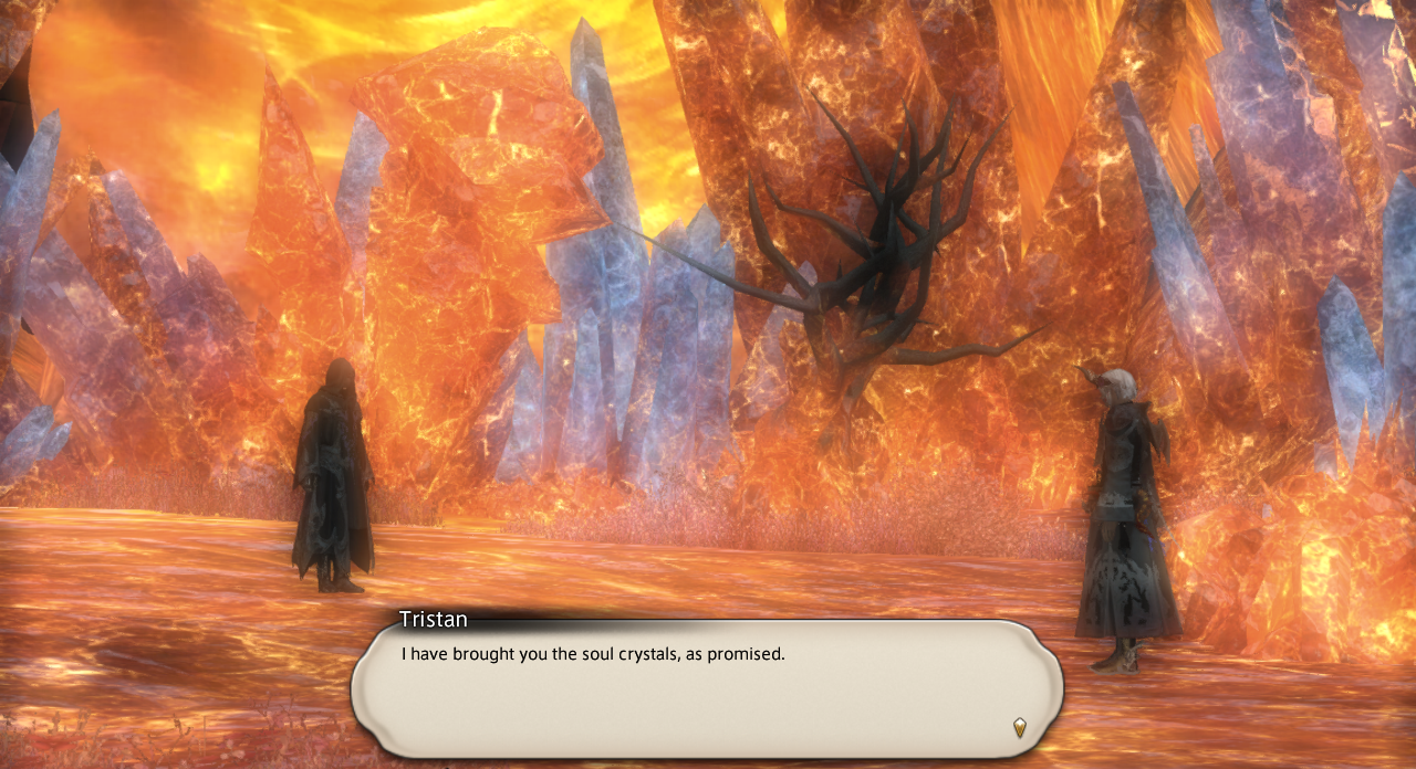 They corner him at the Singing Shards of Mor Dhona, where he is making deals with an Ascian. Handing over several relics, the Ascian imparts him knowledge of an ancient primal, Belias, which he summons in egi form to attack the adventurer and take the Soul Crystal. During the battle he absorbs the egi to empower himself. Once defeated, Tristan rants how he needs this power to destroy the primals. He reveals he was once a member of the Brass Blades, and was forced to execute his brother who was tempered by Ifrit. After revealing his past, Tristan summons Ifrit-Egi to kill himself in an explosion in front of the adventurer and Y'mhitra.