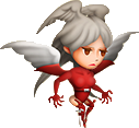 Ultima has long white hair in a same full fringe as Ajora's and brown eyes. She has white succubus ears and wears a red high-neck long-sleeve leotard with a matching long gloves. She wears a red belt and red thigh-high boots with knife holsters adorned with two red belts where she keeps her long dirks. She has white feathered wings combining with small red devil wings at her back.