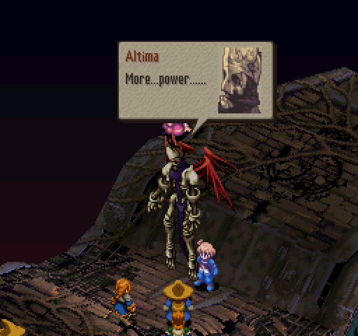 Ultima is resurrected and possesses Alma and attacks Ramza's party. Alma breaks free and Ultima manifests as a demonic being, but is killed by Ramza and his allies. Ultima gathers up even more power in a final effort to preserve her life, but ends up causing an explosion that destroys the Airship Graveyard.