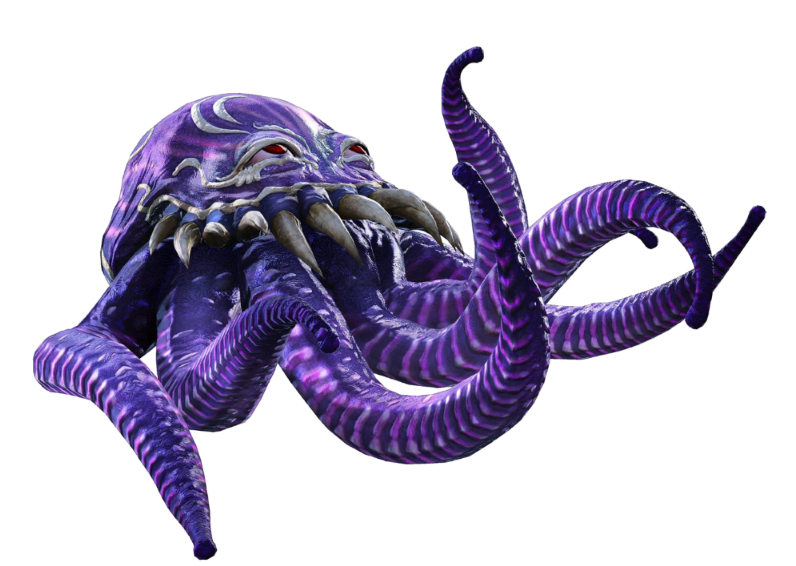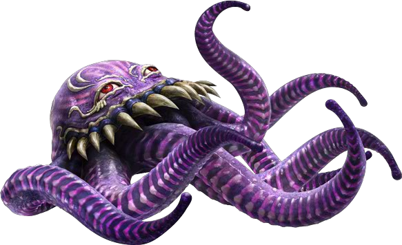 Ultros is a large purple octopus with red eyes and a mass of tentacles that usually appear to emerge from his mouth below a row of sharp fangs, but his lower mouth is never seen. In almost all instances this gives him an iconic mocking grin. Ultros is not always depicted with eight tentacles, as real-life octopuses have, and is sometimes pink instead of purple. He has spots on his body in some appearances, and in Final Fantasy XIII-2 he has white markings. While his exact size varies, Ultros is usually larger than the party. His trademark attacks are Tentacle and Octopus Ink.