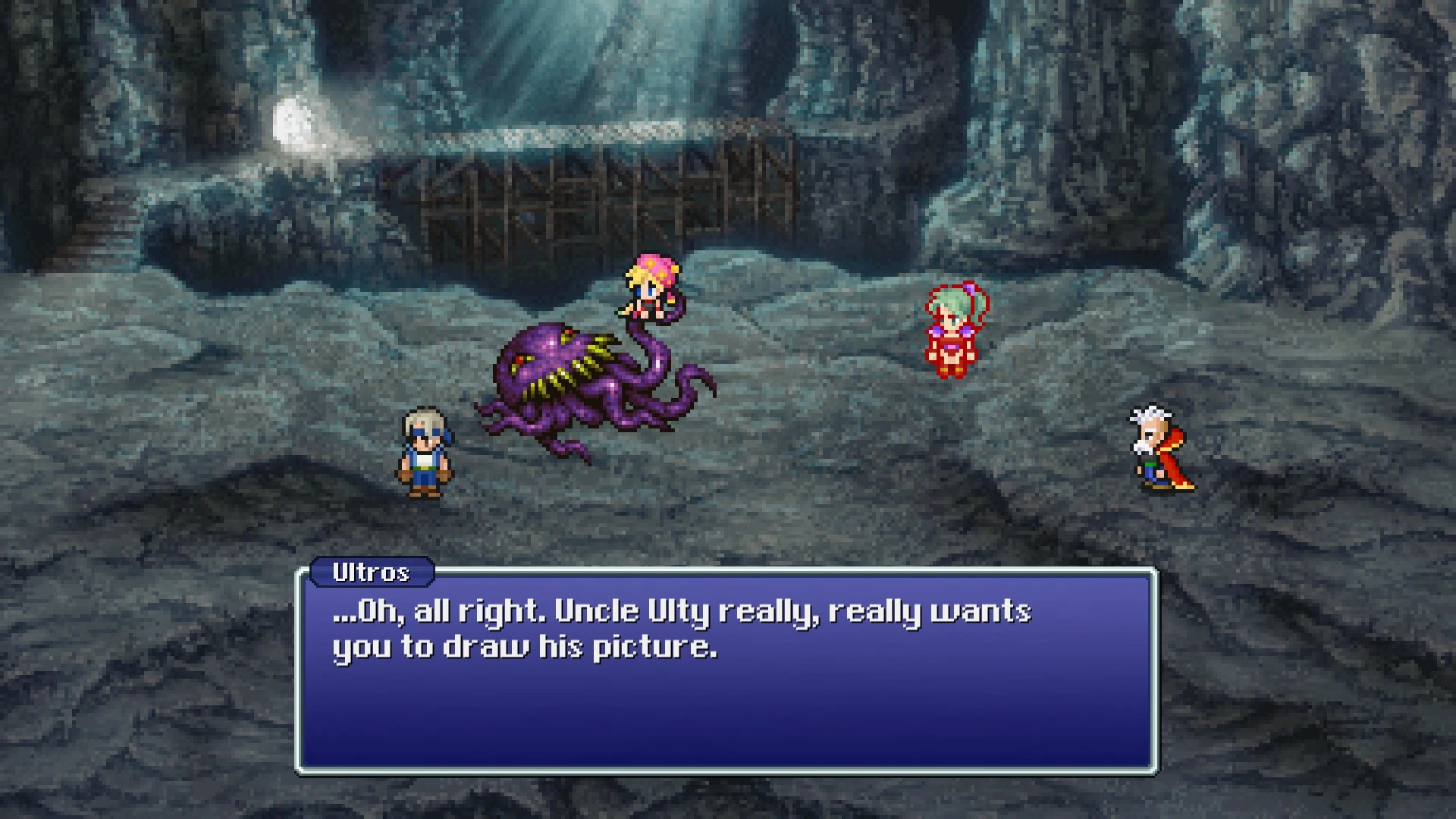 When Terra and Locke went to the Esper Caves with Strago, Ultros ambushed them as they left an altar with three golden statues in effigy to the Warring Triad, and planned to steal them to make Siegfried jealous. When they tried to stop him, Ultros attacked them, again intending to eat them. However, the battle was interrupted by Relm, Strago's granddaughter, who was secretly following them. Relm offered to draw a portrait of Ultros, but he rebuffed her. Relm feigned sadness and pretended she intended to leap off a ledge. She whispered her plan to Terra, and Terra and Locke guilted Ultros into agreeing to a portrait. Relm drew him, and Ultros was horrified the portrait was coming to life to attack him and he fled.