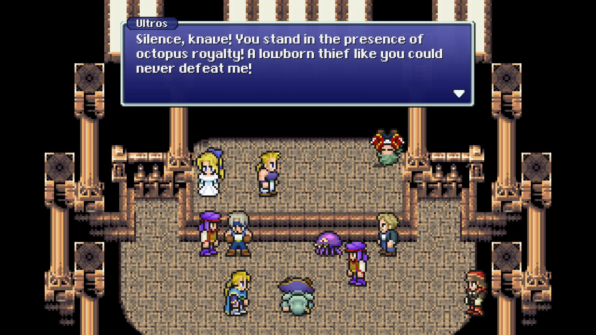Locke and his allies chased Ultros down but fell from the rafters and onto the stage, landing on the two male leads, Draco and Ralse, knocking them unconscious. As the Impresario bemoaned the performance was ruined and the audience began to murmur, Locke improvised that he would be the one to save Celes. Ultros taunted the party, and the two groups fought, with Ultros again intending to eat them. Ultros was defeated and ran, and his scheme to sabotage the Returners' meeting with Setzer failed.