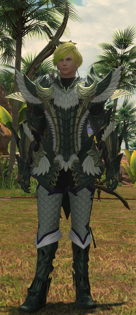 A pale Thavnairian man with bright yellow hair and green streaks, he possesses olive-colored eyes and wields, and an Archeo Kingdom Bow. He wears Augmented Slipstream Mail, Gauntlets, and Breeches of Maiming respectively, and wears Augmented Torrents Boots of Scouting.
