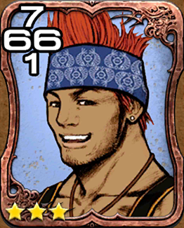 3★ - No. 0527:A young man who appears in the tales of another world where its people are trapped in a spiral of death. Wakka is an avid blitzball player, and the optimistic captain and coach of the ill-fated Besaid Aurochs. He has known Lulu since childhood, and considers Yuna to be a part of his own family. When Tidus suddenly washes ashore the island of Besaid, Wakka can't help but see his deceased brother Chappu in the young man, and takes him under his wing. Not only that, but he also gifts Tidus with the sword that was once his younger brother's.