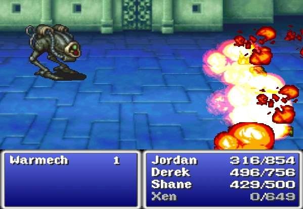 Whether the player succeeds against Warmech depends on their level, how well equipped the party is, what condition the party is in before the fight begins, and how lucky the player is. Warmech battles can quickly turn into desperation as the party dies one by one.