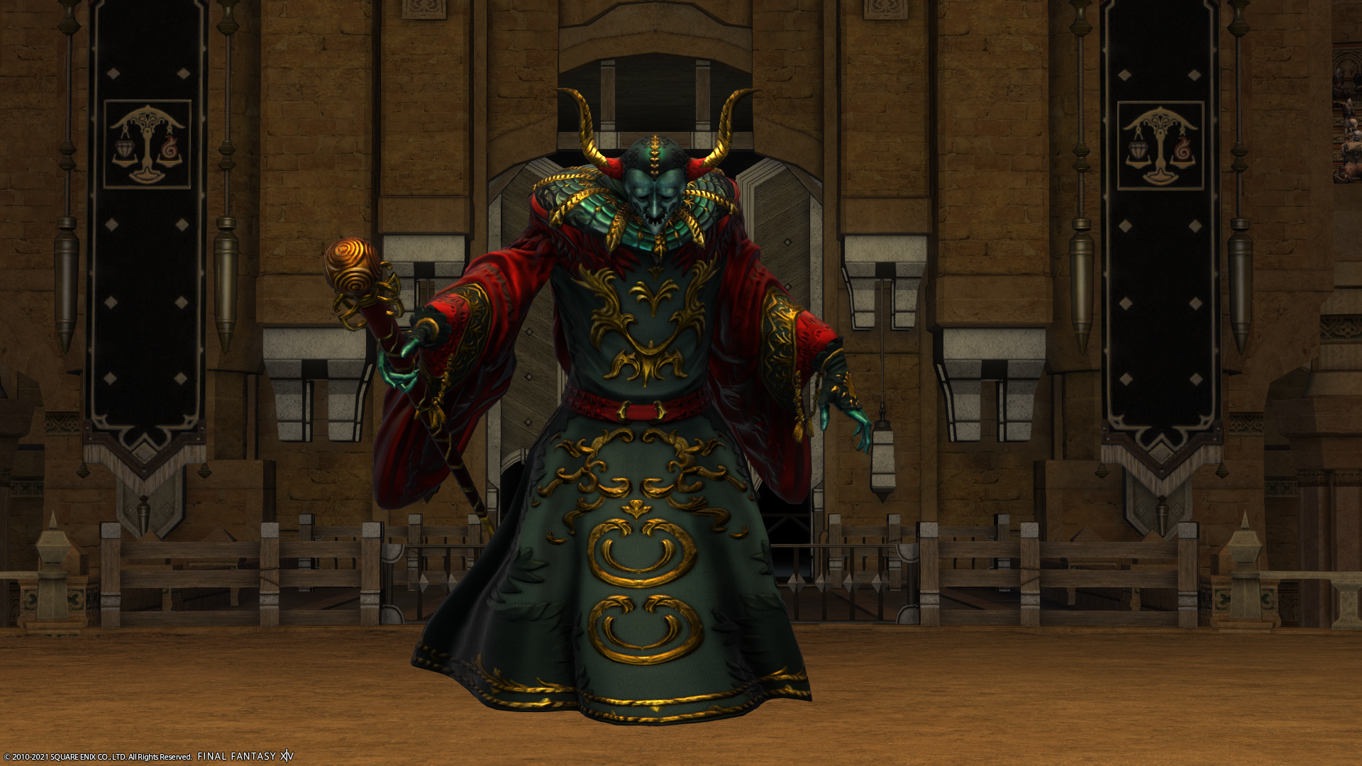 Whastrach came visiting Ul'dah on business, and while there he heard rumors of the Masked Carnivale and blue magic, believing Martyn was behind it. In his spare time, he visited Martyn to see if the rumors were true and joked about his current position before leaving.