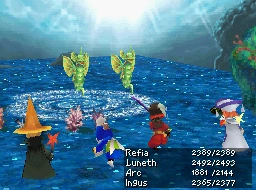 Whirlpool is an ability of the Geomancer job in the Gaia command. It reduces one enemy's HP to a single digit. It can be used on the following terrain: beaches, Walse Tower, ocean, Ship Graveyard, Guido's Cave, and Istory Falls.
