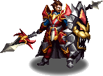 Wilhelm is a middle aged man with short brown hair, blue eyes and sports a mustache. He wears a massive red armor plate with golden borders over blue clothing and white armored boots. He wields a long spear and his large, signature Imperial Shield which resembles a Lion's face with a red jewel on the "forehead" and a white-ish border with several spikes, resembling the "mane".