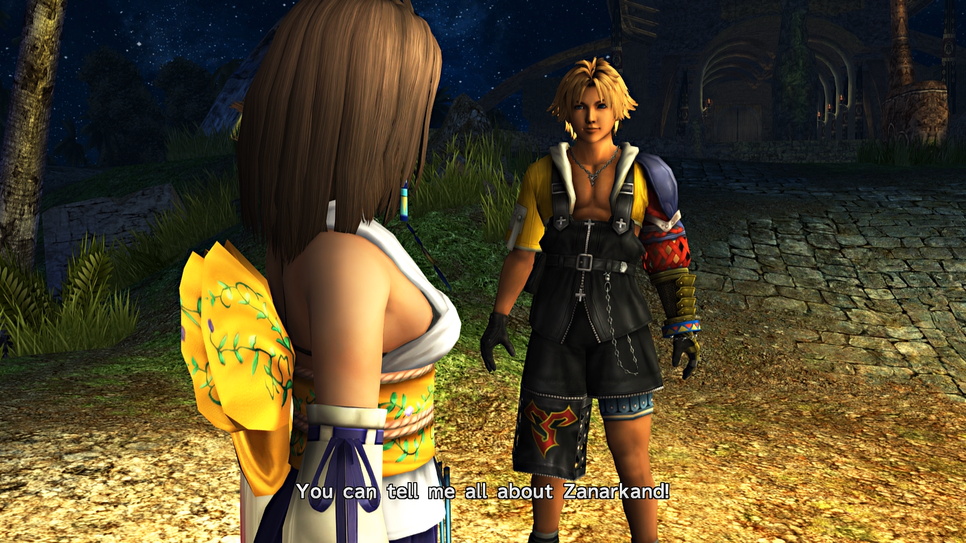 While crossing the Mi'ihen Highroad, the party stops at Rin's Travel Agency to spend the night and Yuna takes the time to make a sphere recording to her guardians containing her final farewells, which she intends to give to them before she performs the Final Summoning. Unaware of what she is doing, Tidus joins her and the two watch the sunset together, with Tidus describing his Zanarkand to her as a metropolis out at sea that never sleeps.