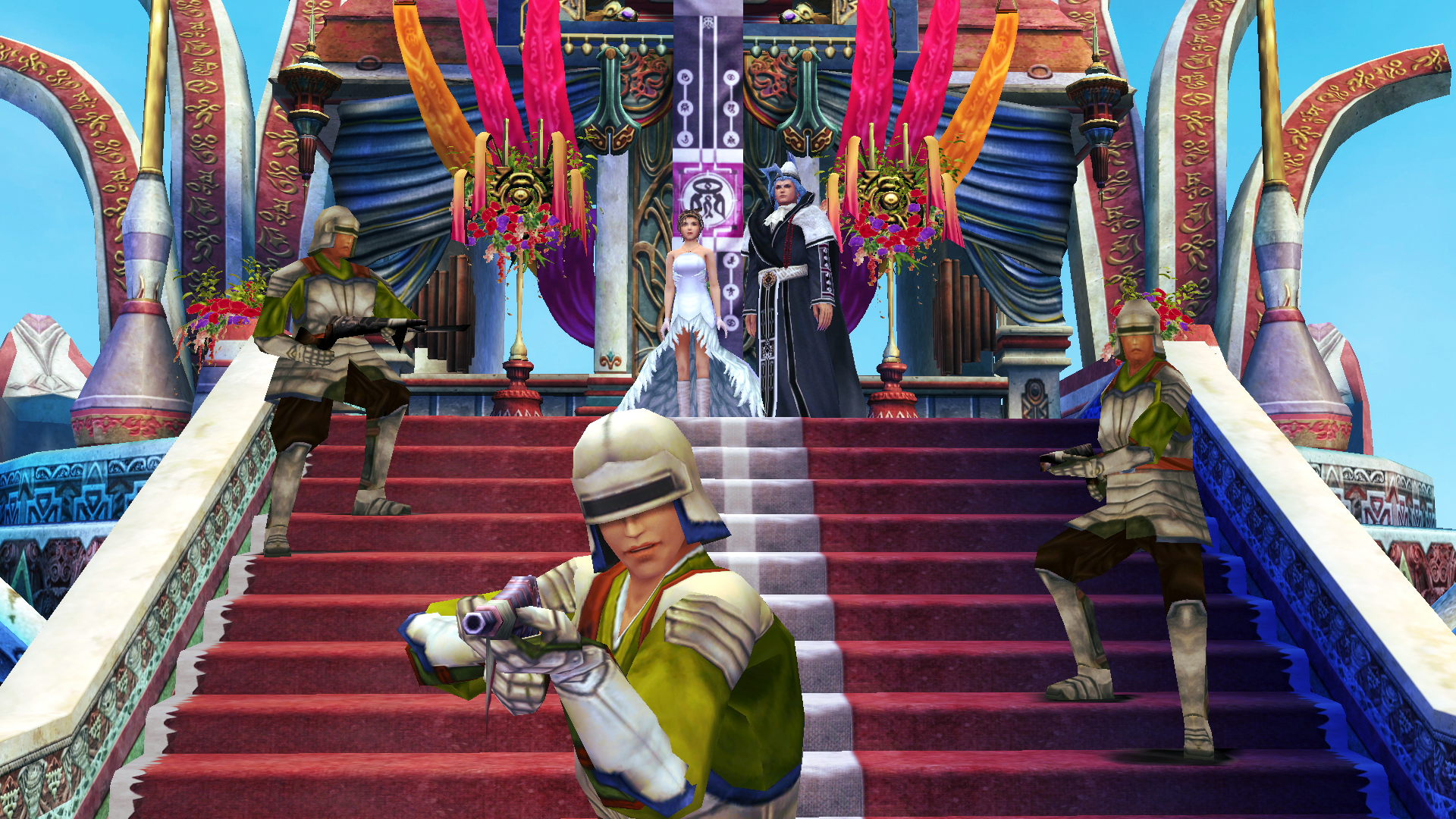 With help from the Al Bhed, Tidus and the other guardians travel to the Palace of St. Bevelle and crash Yuna and Seymour's wedding on Cid's new airship, the Fahrenheit. While her guardians are held at gunpoint, Yuna complies with Grand Maester Mika's ultimatum and her guardians are forced to watch the ceremony be completed. When Seymour orders her guardians to be killed, Yuna lets herself fall off of the temple rooftop and summons Valefor in midair, who flies her to Bevelle Temple.