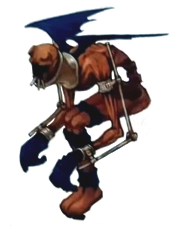 Zalera is a thin, red hunchbacked humanoid figure with dark wings and large hands. His legs are bound together, his eyes are perpetually covered by shadow, he has stumps where horns would seem to be, and three sharp teeth that jut out of his mouth.