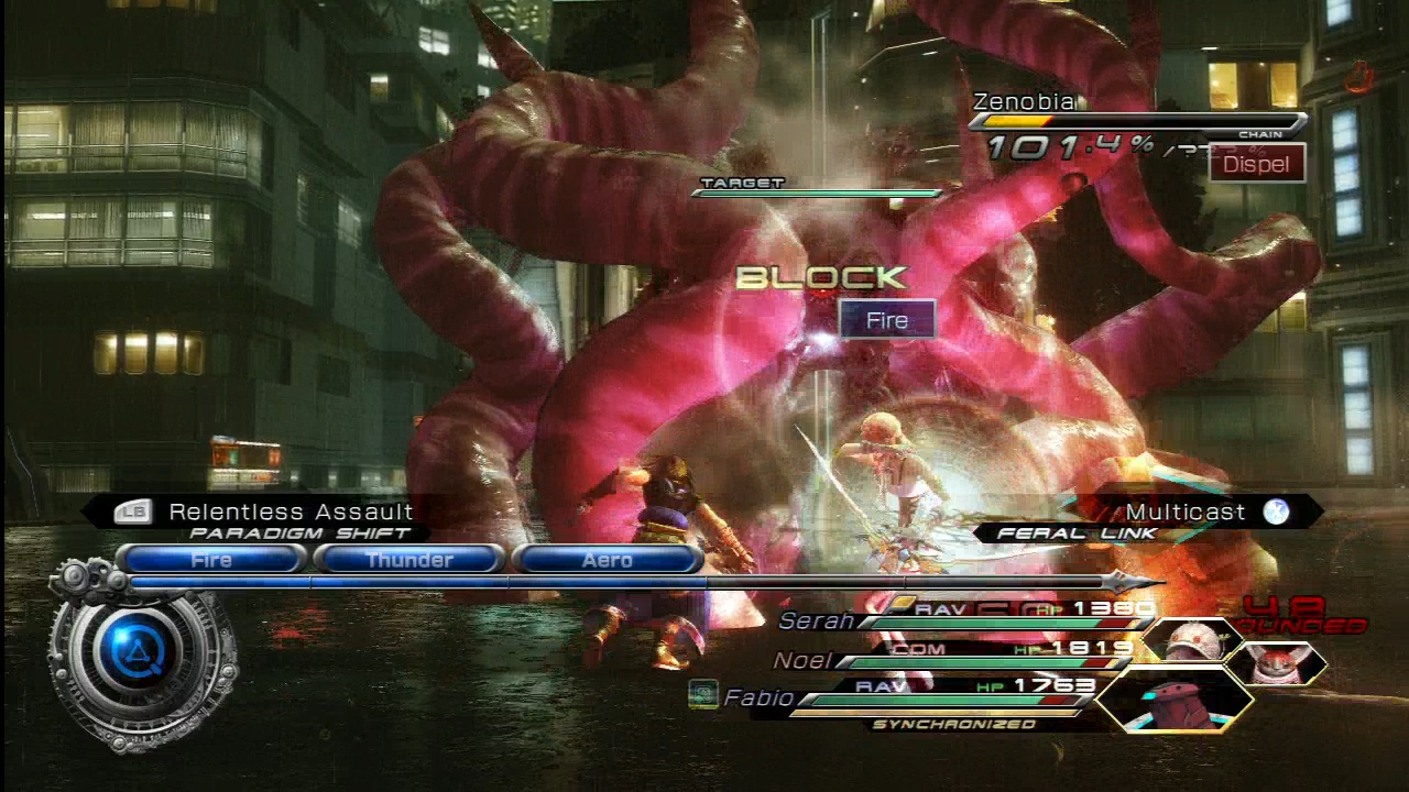 Once Zenobia's protection is gone, the party should switch to Tri-disaster (RAV/RAV/RAV) to build up her stagger meter to 999%. After Zenobia raises the shield again, it is good to switch to a defensive paradigm, like SAB/SAB/MED. After surviving the oncoming assault, the player should return to taking out the tentacles before finishing off Zenobia.